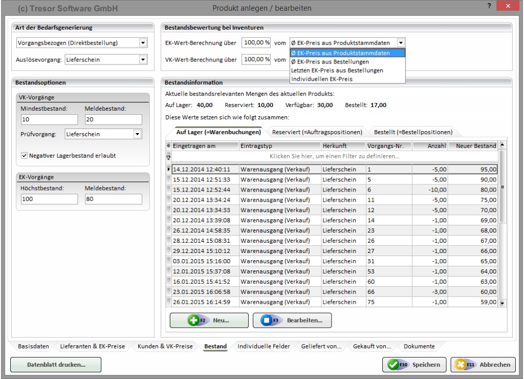 - In Verbindung mit dem Modul "Bestandsverwaltung": Bestandsrelevante Optionen wie Mindest- / Meldebestände, Bewertungspreise uvm.