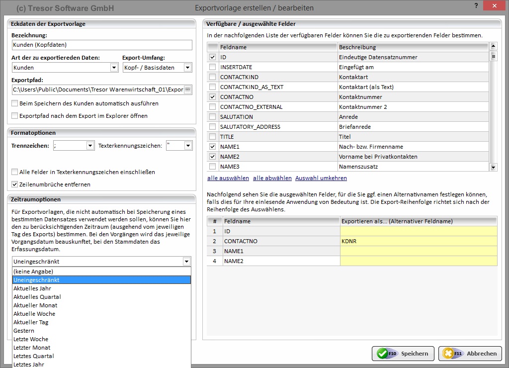 Mit diesem Modul können Sie Datenexportvorlagen für verschiedene Datenarten wie z.B. für Kunden, Lieferanten, Produkte, Lieferscheine etc. anlegen und basierend auf diesen Vorlagen die entsprechenden Daten exportieren. Ein Datenexportvorgang kann entweder manuell oder automatisch bei Speicherung des jeweiligen Referenz-Datensatzes durchgeführt werden. Es werden derzeit folgende Formate unterstützt: CSV. Erfahren Sie mehr über den Programmbereich rund um den Datenexport