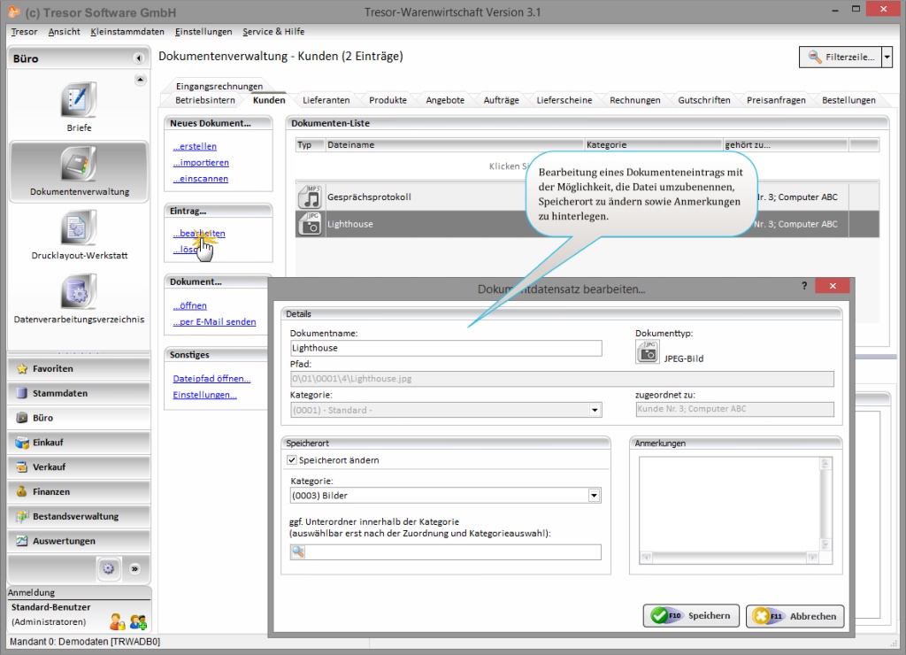 Situationen wie „Wo finde ich noch einmal…“ oder „weiß jemand, wo die Sachen für Hans Müller damals gespeichert wurden?“ gehören mit der Dokumentenverwaltung von Tresor Warenwirtschaft der Vergangenheit an. Erfahren Sie mehr über den Programmbereich rund um die Dokumentenverwaltung