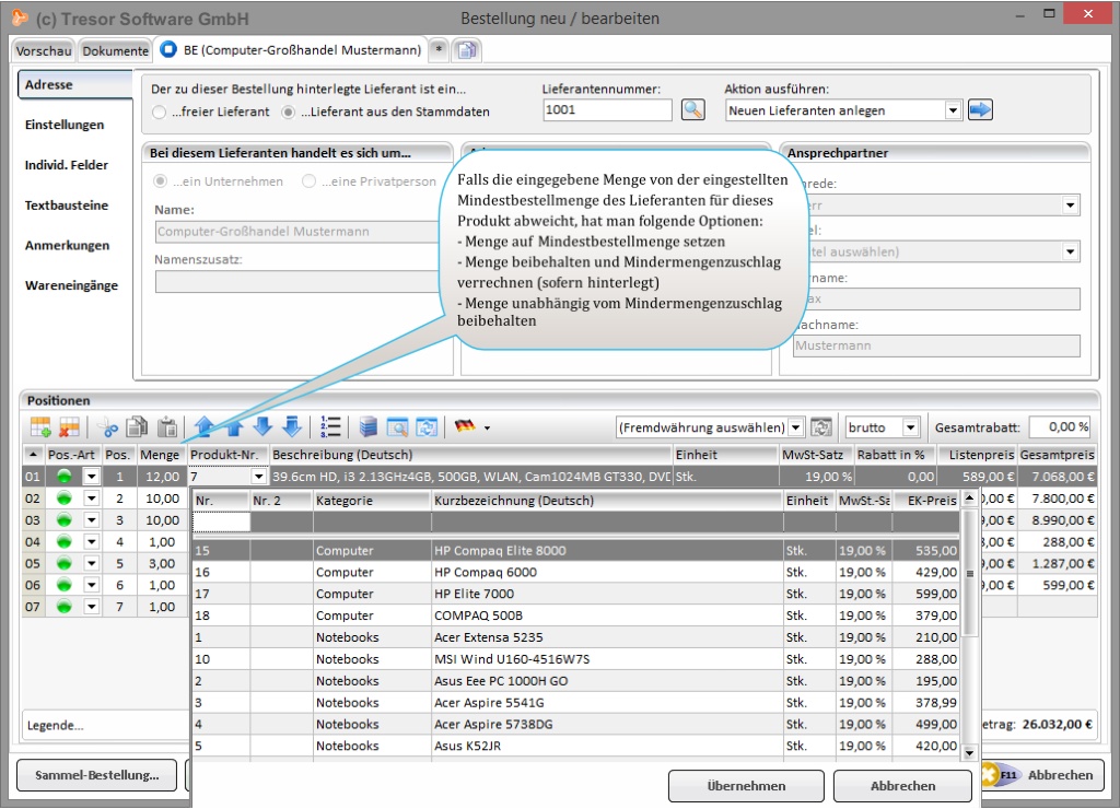 Auch Auftragsabwicklung ist mit Tresor Warenwirtschaft kein Problem. Viele Wege führen zu einem Auftrag bzw. zu einer Auftragsbestätigung: direkte Erstellung, Umwandlung aus einem Angebot oder aus einer Rechnung. Erfahren Sie mehr über den Programmbereich rund um das Erstellen von Aufträgen