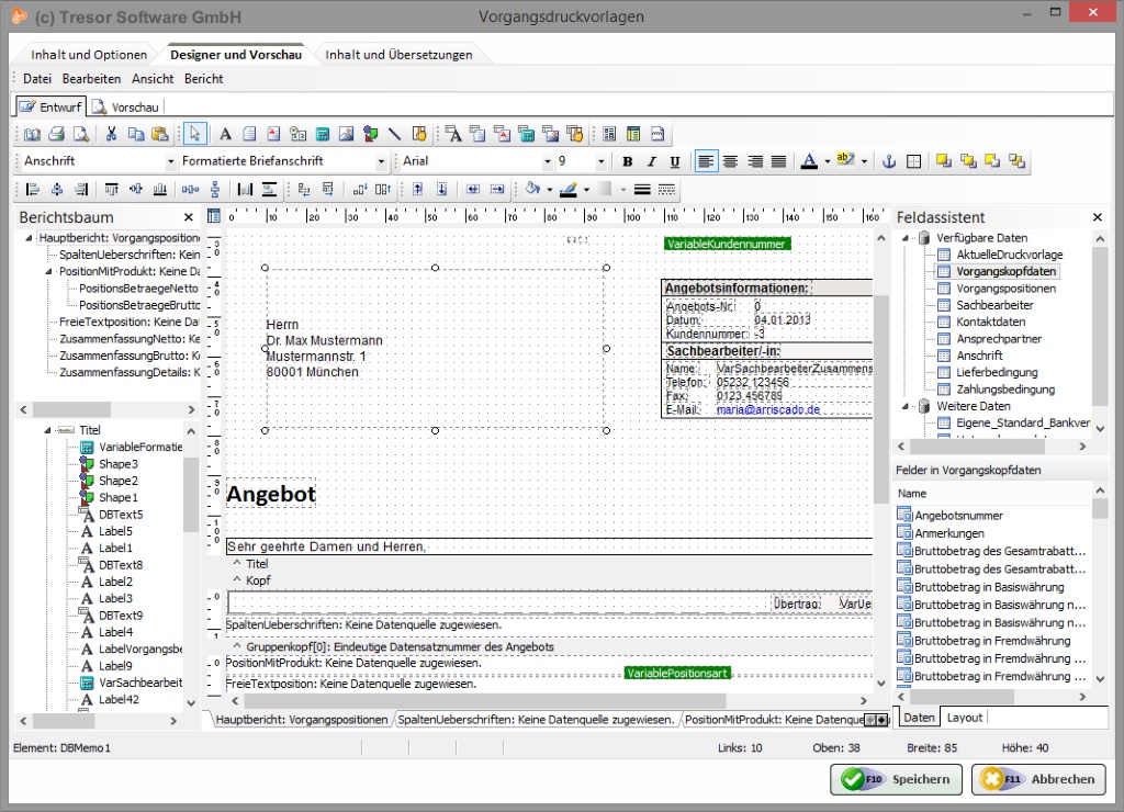 Mit dem integrierten Designer können sowohl Briefpapiervorlagen - wie man sie in vorgedruckter Form von der Druckerei kennt - als auch die eigentlichen Datendruckvorlagen für Angebote, Rechnungen etc. nach Wunsch gestaltet werden. Im Auslieferungszustand der Software sind bereits viele Druckvorlagen enthalten, die als Grundlage verwendet werden können. Erfahren Sie mehr über den Programmbereich rund um die Formulargestaltung