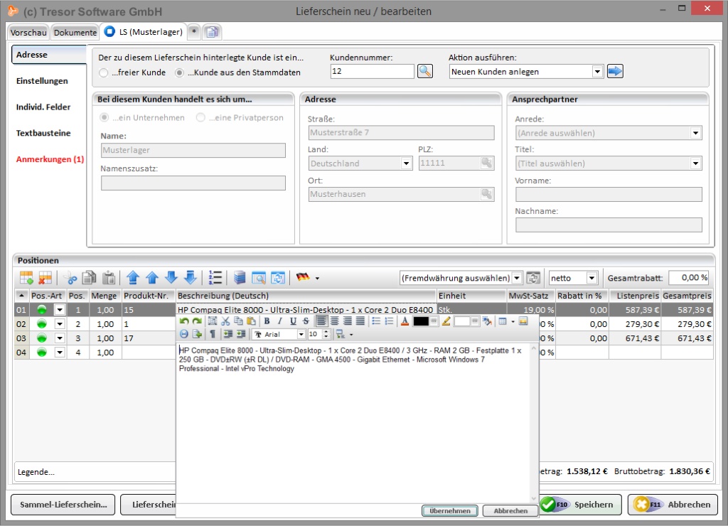 Ist der Auftrag erledigt, dann gilt es die Ware zu liefern. Das bedeutet, dass ein Lieferschein erstellt werden muss. Lieferscheinerstellung ist mit Tresor Warenwirtschaft ein Leichtes. Lieferscheine können direkt erstellt oder aus anderen Vorgängen umgewandelt werden. Natürlich können sie auch weiterverarbeitet werden - z.B. zu einer Rechnung. Erfahren Sie mehr über den Programmbereich rund um die Lieferscheinverwaltung