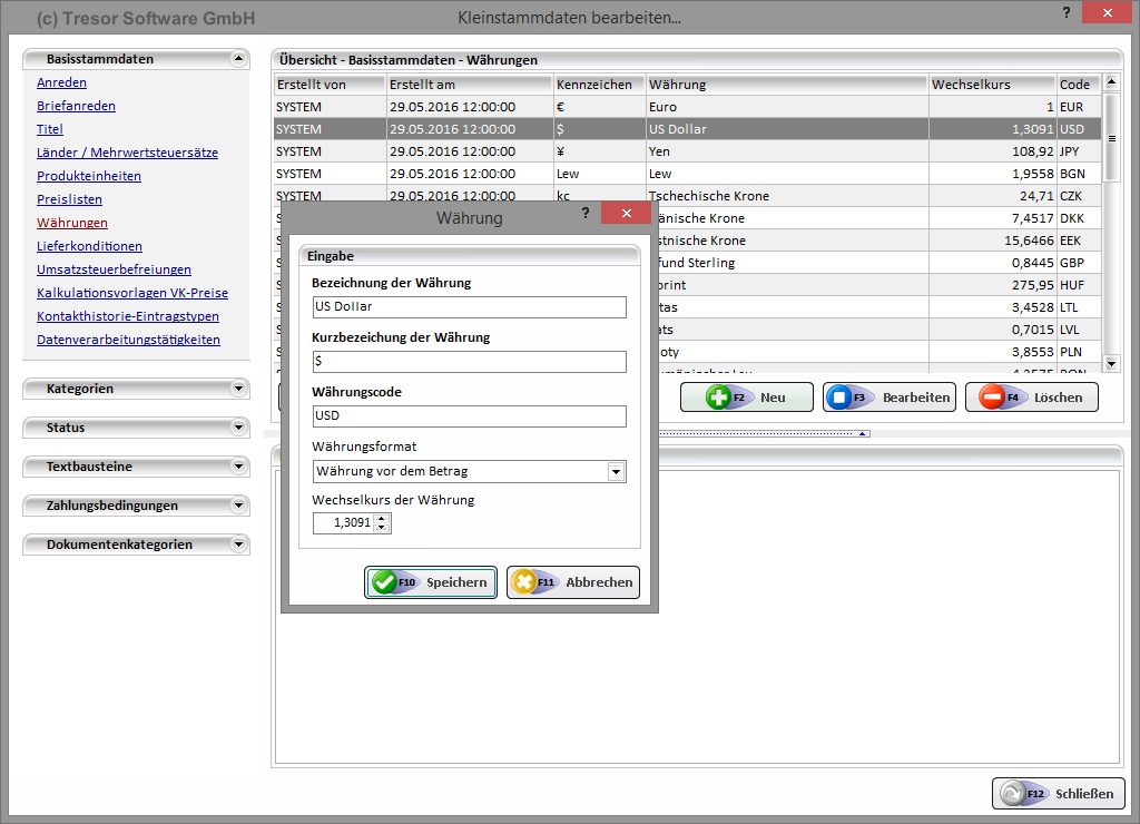 In Tresor Warenwirtschaft können all diese Kleinstammdaten an einer zentralen Stelle verwaltet werden. Je nach Art der Daten variieren die zu machenden Angaben beispielsweise von einer einfachen Bezeichnung einer Produktkategorie bis hin zu mehreren Angaben einer Zahlungskondition wie z.B. Skonto, Zahlungsziel, Mahnstufen etc.