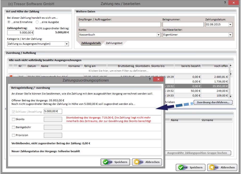 • Erfassen Anzahlungen, Schlusszahlungen, Skonto-, Provision- und Bankgebührbuchungen möglich